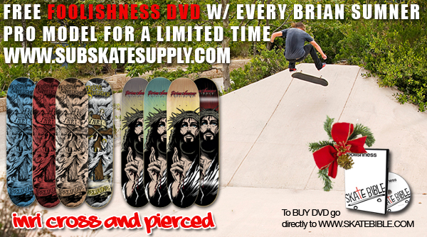 A video featuring Brian Sumner, Steve Cab, Christian Hosoi and many other skaters showing their love for skating, while representing Christ. Only $15 or you can buy a Brian Sumner Pro Model Deck from